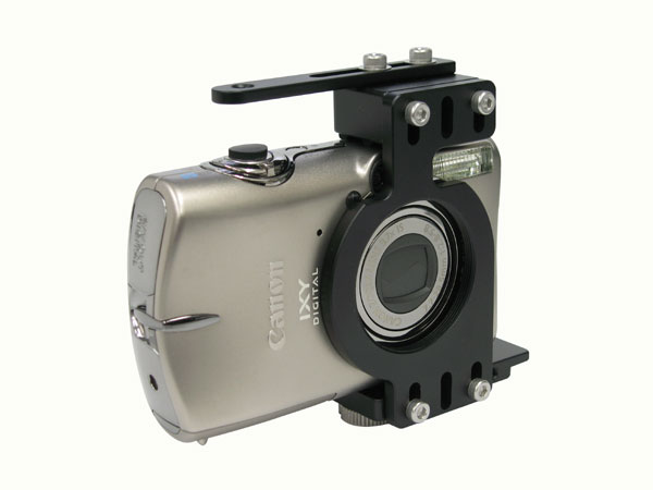 IXY DIGITAL 2000 ISのレンズ面が上に向くように置き、写真のようにBR-IXYsu2を取り付けます。 |