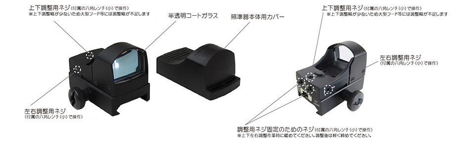 当製品をホットシューへ装着後、斜め下に配置(両眼視に有効)するケースでは、眼鏡使用の場合、照準器本体に干渉することがあります。予めご了承ください。 |