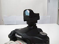 照準器を装着後、10mくらい先のわかりやすい目印をデジタル一眼レフカメラのファインダーの中心部分に導入し、カメラ雲台をしっかりと固定しておき、上記の方法で照準器のドットを目印に合わせます。 |