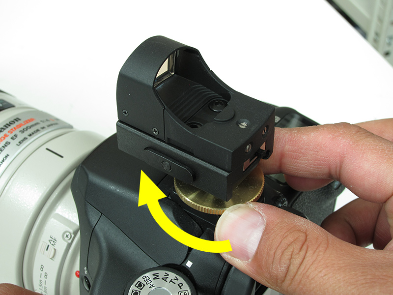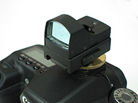 照準器を装着後、10mくらい先のわかりやすい目印をデジタル一眼レフカメラのファインダーの中心部分に導入し、カメラ雲台をしっかりと固定しておき、上記の方法で照準器のドットを目印に合わせます。 |