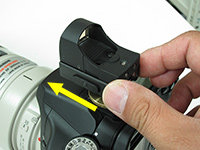 今回採用しております小型照準器は光源のLEDの向きを小ネジを回すことで上下・左右に微調整する機能があります。大口径のカメラレンズで10m以内のターゲットを狙う場合、光点がフードにかぶって調整範囲では対応できない場合があります。DOS-HS07及びDOS-HS06をお使い頂くことをお勧めします。 |
